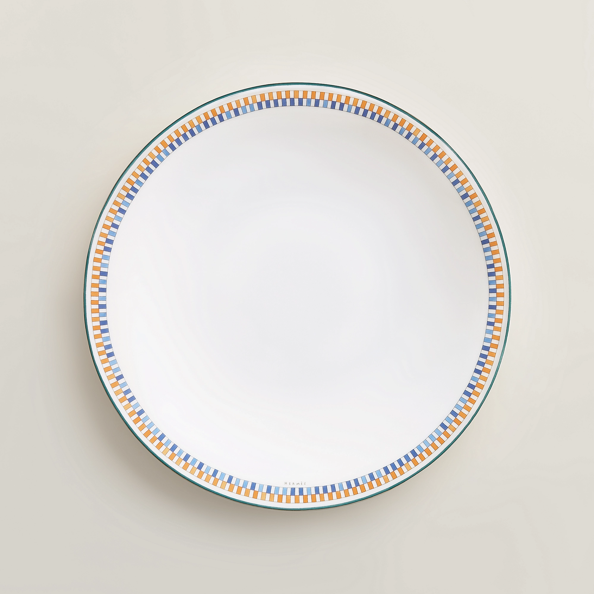 Piatto piano in porcellana Decorazioni cromolitografiche applicate a mano sulla porcellana Il servizio Hermès en Contrepoint è un invito a giocare con gli abbinamenti e le sovrapposizioni. I fregi colorati decorano i 33 pezzi del servizio per il pranzo, la cena e il tè o il caffè.