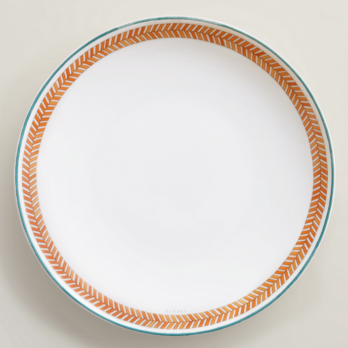 Piatto da dessert in porcellana Decorazioni cromolitografiche applicate a mano sulla porcellana Il servizio Hermès en Contrepoint è un invito a giocare con gli abbinamenti e le sovrapposizioni. I fregi colorati decorano i 33 pezzi del servizio per il pranzo, la cena e il tè o il caffè.