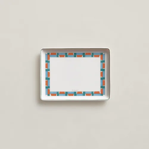 Tazza da tè con piattino in porcellana Decorazioni cromolitografiche applicate a mano sulla porcellana Il servizio Hermès en Contrepoint è un invito a giocare con gli abbinamenti e le sovrapposizioni. I fregi colorati decorano i 33 pezzi del servizio per il pranzo, la cena e il tè o il caffè.