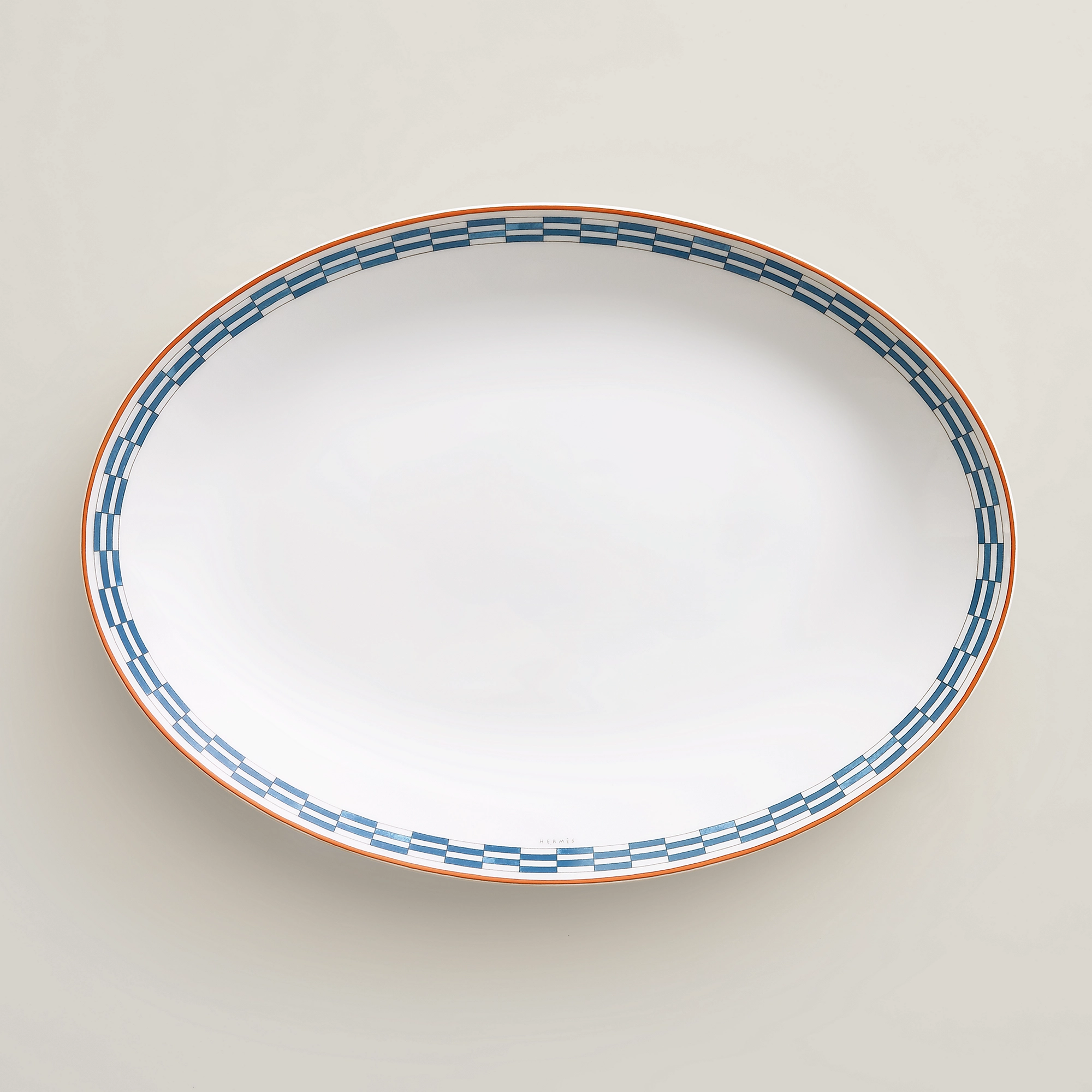 Piatto ovale in porcellana Decorazioni cromolitografiche applicate a mano sulla porcellana Il servizio Hermès en Contrepoint è un invito a giocare con gli abbinamenti e le sovrapposizioni. I fregi colorati decorano i 33 pezzi del servizio per il pranzo, la cena e il tè o il caffè.
