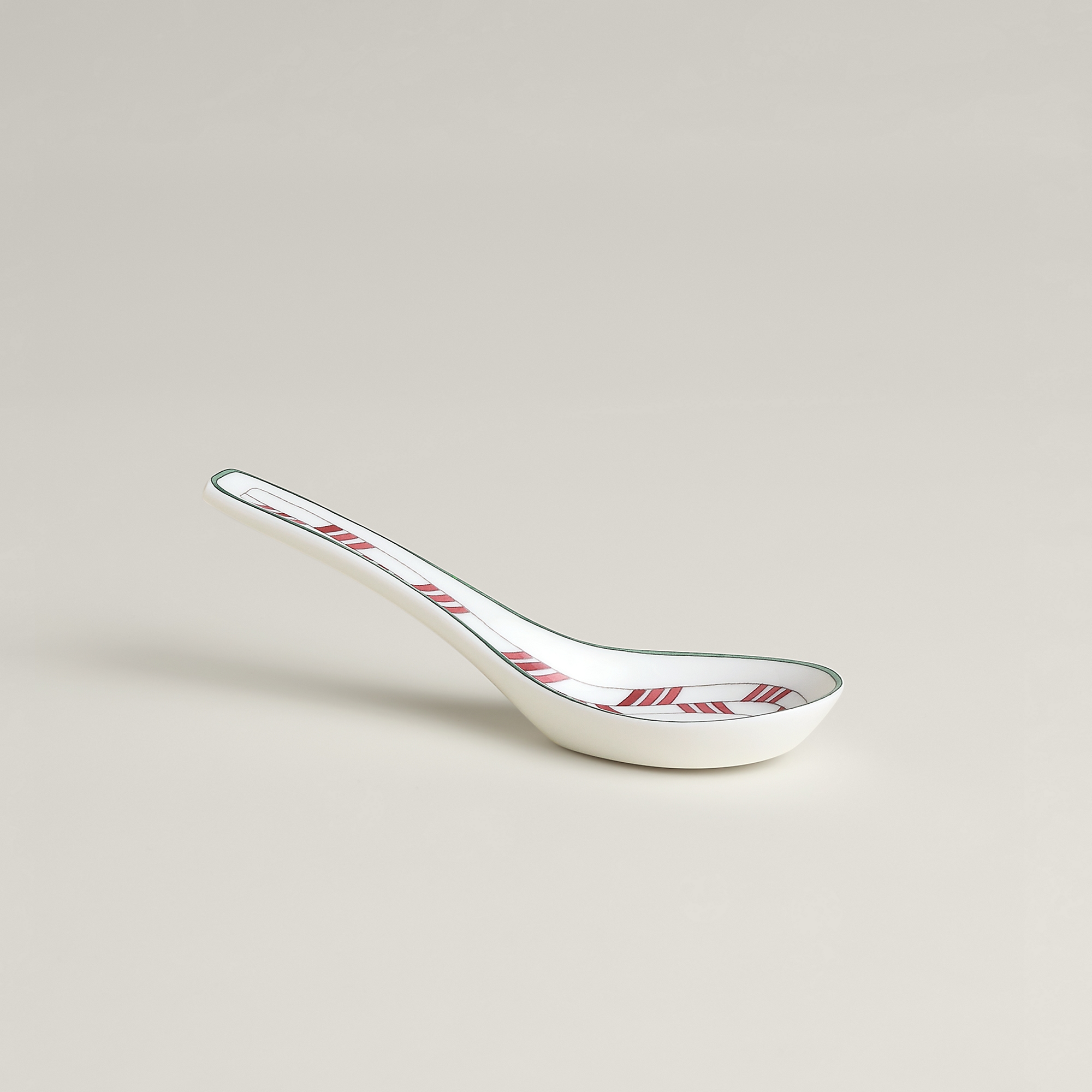 Cucchiaio da zuppa in porcellana Decorazioni cromolitografiche applicate a mano sulla porcellana Il servizio Hermès en Contrepoint è un invito a giocare con gli abbinamenti e le sovrapposizioni. I fregi colorati decorano i 33 pezzi del servizio per il pranzo, la cena e il tè o il caffè.