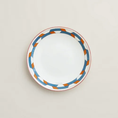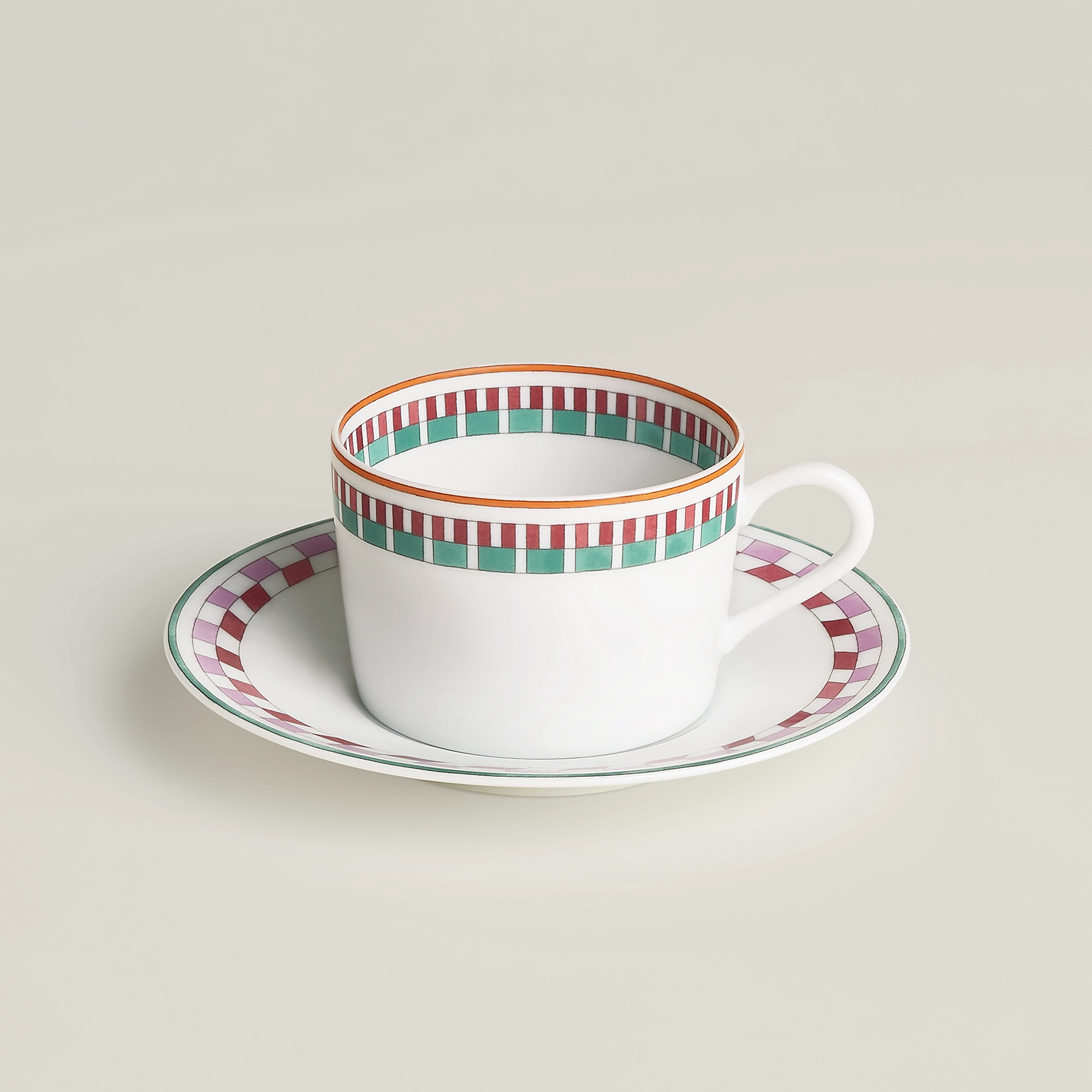 Tazza da tè con piattino in porcellana Decorazioni cromolitografiche applicate a mano sulla porcellana Il servizio Hermès en Contrepoint è un invito a giocare con gli abbinamenti e le sovrapposizioni. I fregi colorati decorano i 33 pezzi del servizio per il pranzo, la cena e il tè o il caffè.