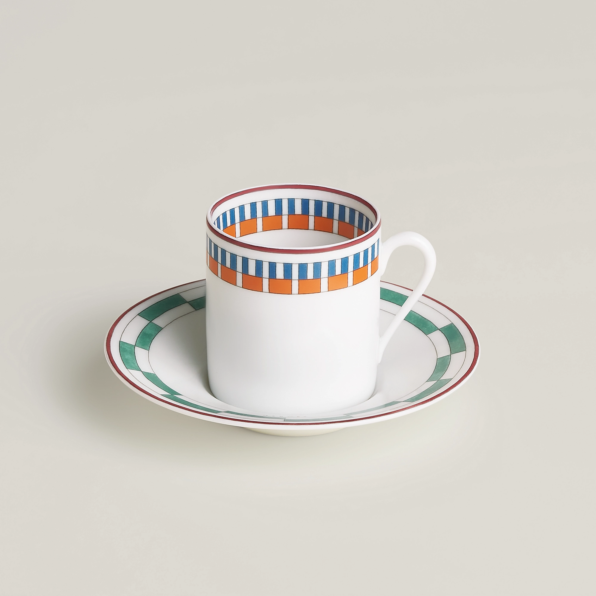 Tazzina da caffè con piattino in porcellana Decorazioni cromolitografiche applicate a mano sulla porcellana Il servizio Hermès en Contrepoint è un invito a giocare con gli abbinamenti e le sovrapposizioni. I fregi colorati decorano i 33 pezzi del servizio per il pranzo, la cena e il tè o il caffè.