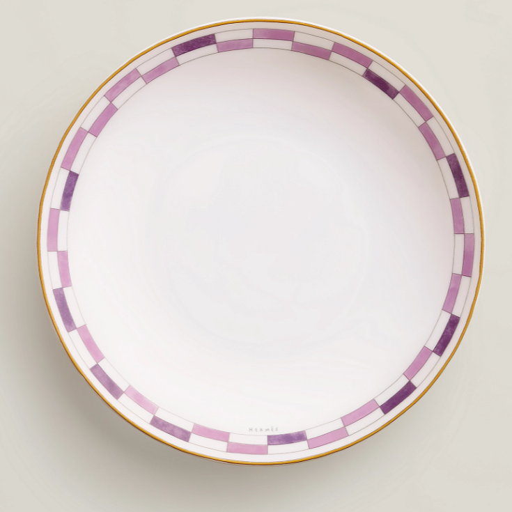 Piatto da dessert in porcellana Decorazioni cromolitografiche applicate a mano sulla porcellana Il servizio Hermès en Contrepoint è un invito a giocare con gli abbinamenti e le sovrapposizioni. I fregi colorati decorano i 33 pezzi del servizio per il pranzo, la cena e il tè o il caffè.