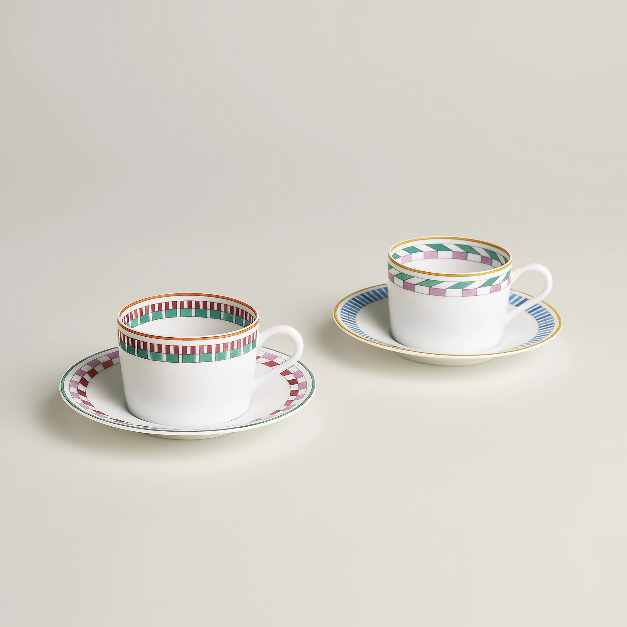 Set di 2 tazze da tè con piattino in porcellana Decorazioni cromolitografiche applicate a mano sulla porcellana Il servizio Hermès en Contrepoint è un invito a giocare con gli abbinamenti e le sovrapposizioni. I fregi colorati decorano i 33 pezzi del servizio per il pranzo, la cena e il tè o il caffè.