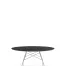 Lampada da tavolo disponibile nella versione con base in vetro, paralume in tessuto e struttura in metallo laccato oppure con diffusore in vetro e base in metallo cromato.